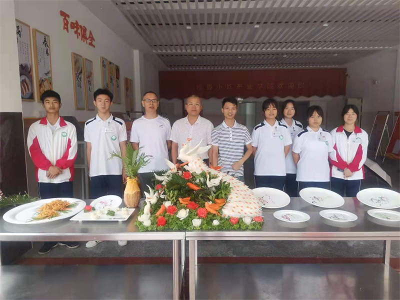 烹饪专业的学生分别展示了雕刻、热菜、面点制作以及画盘技术。其中,雕刻作品《孔雀迎宾》雍容大气,白萝卜摇身一变成为华丽孔雀与娇艳欲滴的花朵,胡萝卜雕刻成的小鸟在“绿草丛”中欢快鸣唱。热菜作品《花开富贵》虽已展示多时,依旧香气扑鼻。裹粉炸制的《菊花鸡脯》黄得似金,均匀的线条展示着学生们精湛的技艺和纯熟的刀功。面点油酥点心《鼠(数)你最棒》制作的栩栩如生,七只小老鼠活似乎就灵活现的在我们眼前活动。