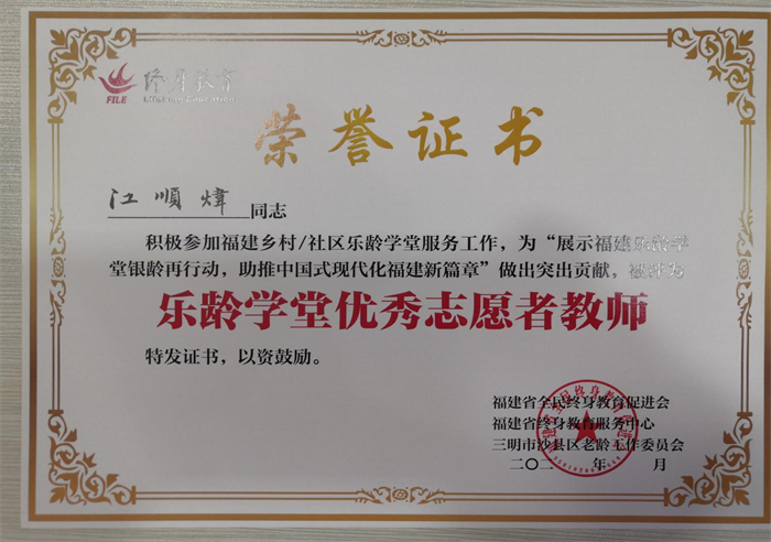 江顺炜老师获评乐龄学堂优秀志愿者教师